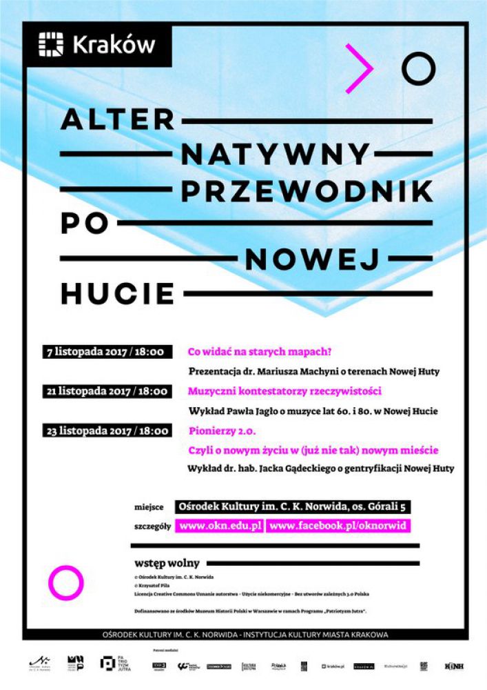 ALTERNATYWNY PRZEWODNIK PO NOWEJ HUCIE - działania edukacyjno-animacyjne z zakresu dziejów lokalnych w postaci spacerów szlakami dziedzictwa kulturowego, prelekcji o nieoczywistych historiach dotyczšcych terenów Nowej Huty oraz prezentacji miejsc, które odwołujš się do lokalnej tożsamoœci. Projekt zakończy wydanie tworzonej kolektywnie publikacji w formie alternatywnego przewodnika po przestrzeni i dziejach Nowej Huty w formie drukowanej i elektronicznej. Dofinansowano ze œrodków Muzeum Historii Polski w Warszawie w ramach Programu „Patriotyzm Jutra”.