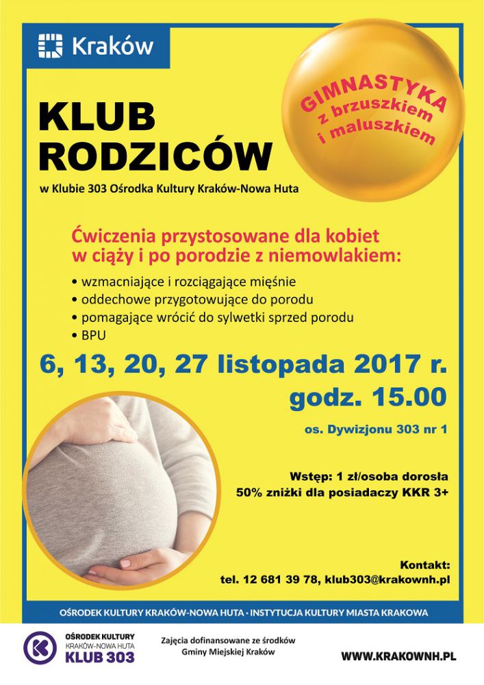 Klub 303 Orodka Kultury Kraków-Nowa Huta (os. Dywizjonu 303 nr 1) zaprasza w poniedziałek 20 listopada w godz. 15.00-15.45 na Gimnastykę dla kobiet w cišży i po porodzie z niemowlakiem. W programie zajęć: ćwiczenia wzmacniajšce mięnie, ćwiczenia oddechowe przygotowujšce do porodu, ćwiczenia BPU po porodzie oraz seria ćwiczeń wzmacniajšcych i rozcišgajšcych mięnie, korygujšcych ewentualnš nadwagę, kształtujšcych sylwetkę sprzed porodu.