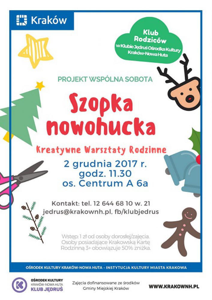 Szopka jest nieodłšcznym elementem wišt w Krakowie. Klub Jędru Orodka Kultury Kraków-Nowa Huta (os. Centrum A 6a) zaprasza w sobotę 2 grudnia w godz. 11.30-13.30 na rodzinne warsztaty kreatywne, podczas których dzieci z opiekunami pod okiem instruktorów przygotujš tradycyjnš szopkę krakowskš z elementami nowohuckimi. Prowadzenie: Anna Ratecka