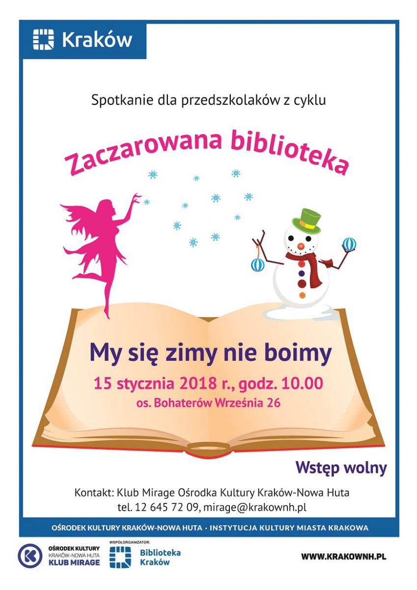 Pojawienie się zimy powoduje wiele zmian. Wiadomo, że zima jest wtedy, gdy nie widać piaskownicy, bo wszystko pokryte jest białš pierzynkš. Zima to dokarmianie ptaków, robienie aniołków na niegu, jazda na sankach czy lepienie bałwana. A co robić zimš, kiedy nie ma niegu? O tym włanie będzie mowa na kolejnych zajęciach z cyklu Zaczarowana biblioteka. Mimo braku niegu pojedzimy na nartach a nawet ulepimy wspólnie bałwana!