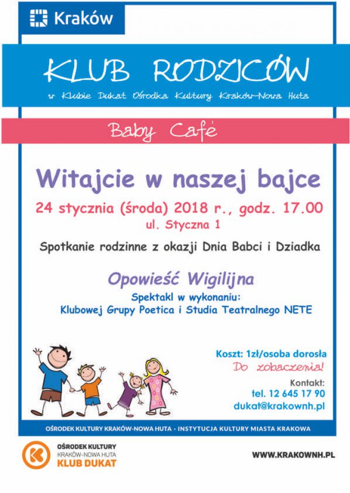 Klub Dukat Orodka Kultury Kraków-Nowa Huta (ul. Styczna 1) zaprasza w rodę 24 stycznia o godz. 17.00 na spektakl w ramach Klubu Rodziców. Opowieć wigilijna pokazuje niezwykłš przemianę skšpego, bezdusznego, samolubnego kupca w hojnego, serdecznego, sympatycznego człowieka. Podczas wišt Bożego Narodzenia zaczyna rozumieć, że pienišdze szczęcia nie dajš, staje się dobry dla innych i docenia wreszcie magię wišt. Spektakl w wykonaniu: Klubowej Grupy Poetica i Studia Teatralnego NETE