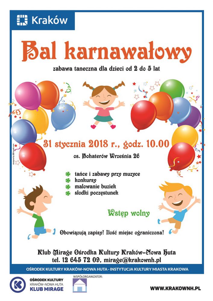 Klub Mirage Oœrodka Kultury Kraków-Nowa Huta (os. Bohaterów Wrzeœnia 26) zaprasza na Bal kostiumowy dla dzieci w œrodę 31 stycznia o godz. 10.00. Karnawał w pełni. Czas balów i zabaw. Dzieci uwielbiajš takie wydarzenia i czekajš na nie z zapartym tchem. To również moment, kiedy można przebierać się do woli i zmieniać się w kogoœ innego. Karnawałowego spotkania nie mogło zabraknšć także w Klubie Mirage, który zaprasza na œwietnš zabawę w rytm znanych i lubianych dziecięcych przebojów. W programie Balu Przebierańców znajdš się gry, zabawy i konkursy m.in. konkurs na najciekawsze przebranie.