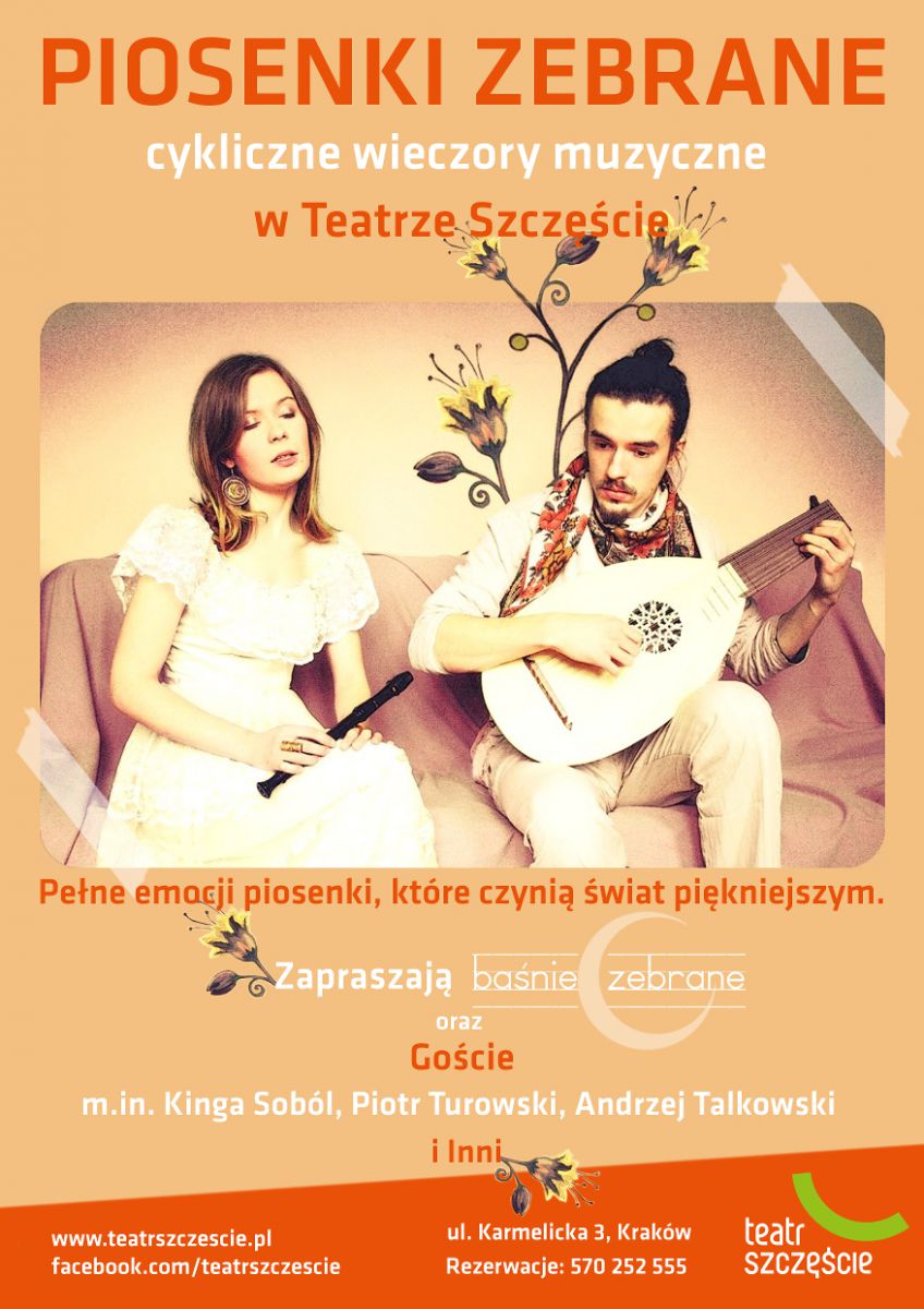 „Piosenki zebrane” to cykliczne wieczory muzyczne w Teatrze Szczęœcie, na które zapraszajš Baœnie Zebrane oraz Goœcie.