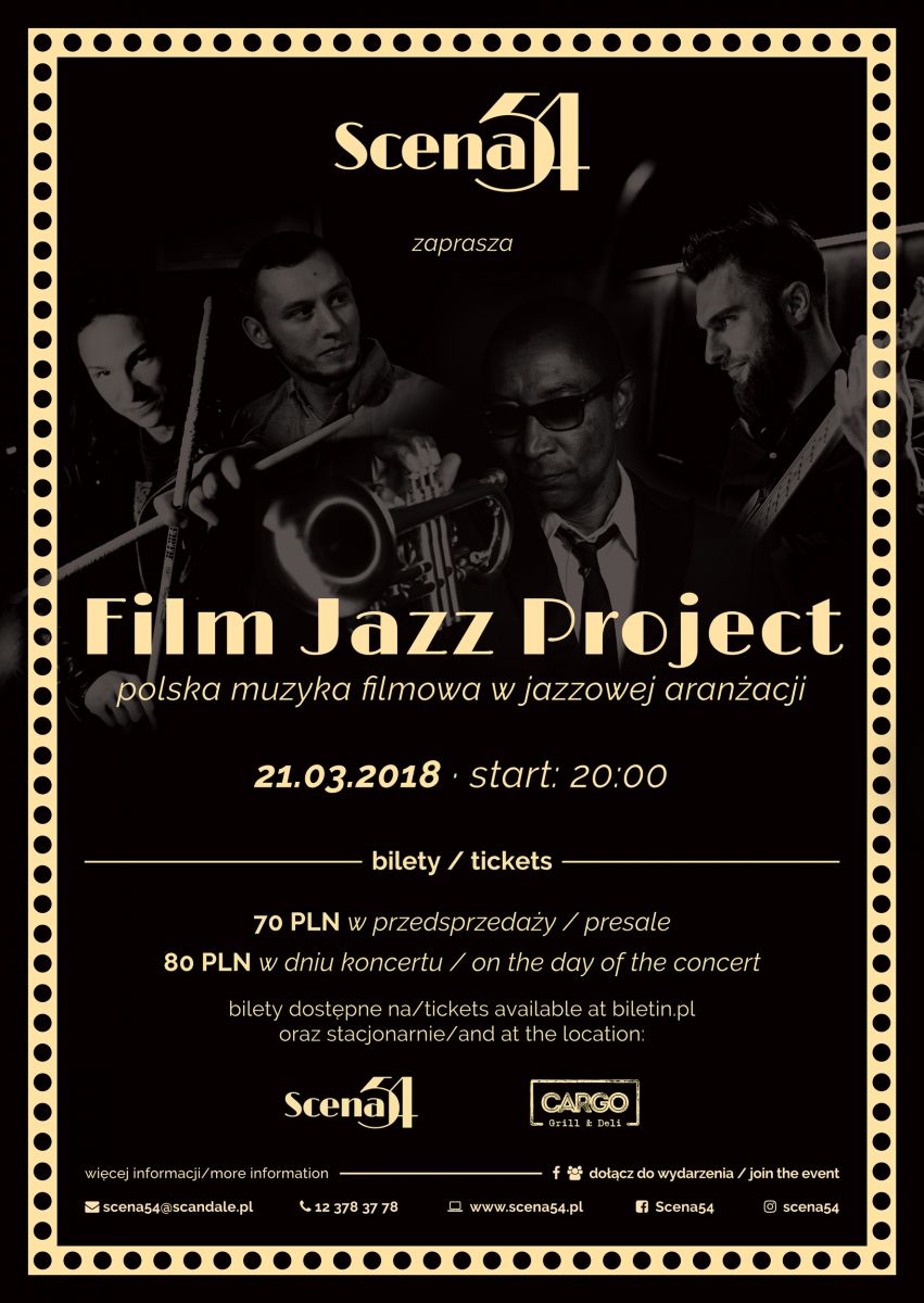 Scena54 to elegancki cocktail bar, który jest unikatowš propozycjš dla goci powyżej 30 roku życia. Subtelnie nawišzujšc do spucizny słynnego nowojorskiego Studio 54, oferuje bogaty program rozrywkowo-kulturalny. Już 21.03 (w rodę) zaprasza na wydarzenie wyjštkowe - tego dnia odbędzie się koncert, w którym wybitni muzycy jazzowi podejmš się interpretacji polskiej muzyki filmowej w nowej, intrygujšcej jazzowej aranżacji. Film Jazz Project - Zagraniczni Artyci grajš polskš muzykę filmowš to idea, która powstała w 2012 roku z inicjatywy Dominika Jastrzębskiego i Michała Czekały. Przez ten czas z projektem współpracowali m. in. Michael Patches Stewart, Derrick McKenzie, Nathan Williams, Frank Parker Jr., Femi Temowo, Luis Nubiola oraz wielu znakomitych polskich muzyków. Film Jazz Project stawia na promocję młodych polskich artystów,którzy dzięki współpracy ze znanymi muzykami zagranicznymi, czerpiš wiedzę i dowiadczenie inspirujšce w dalszej karierze muzycznej. Film Jazz Project przedstawia swoje własne, oryginalne i niespotykane spojrzenie na ciekawš, a niejednokrotnie niedocenianš, częć rodzimej spucizny muzycznej, którš jest polska muzyka filmowa. Jest to także szansa na przedstawienie dorobku polskich kompozycji wiatu.
