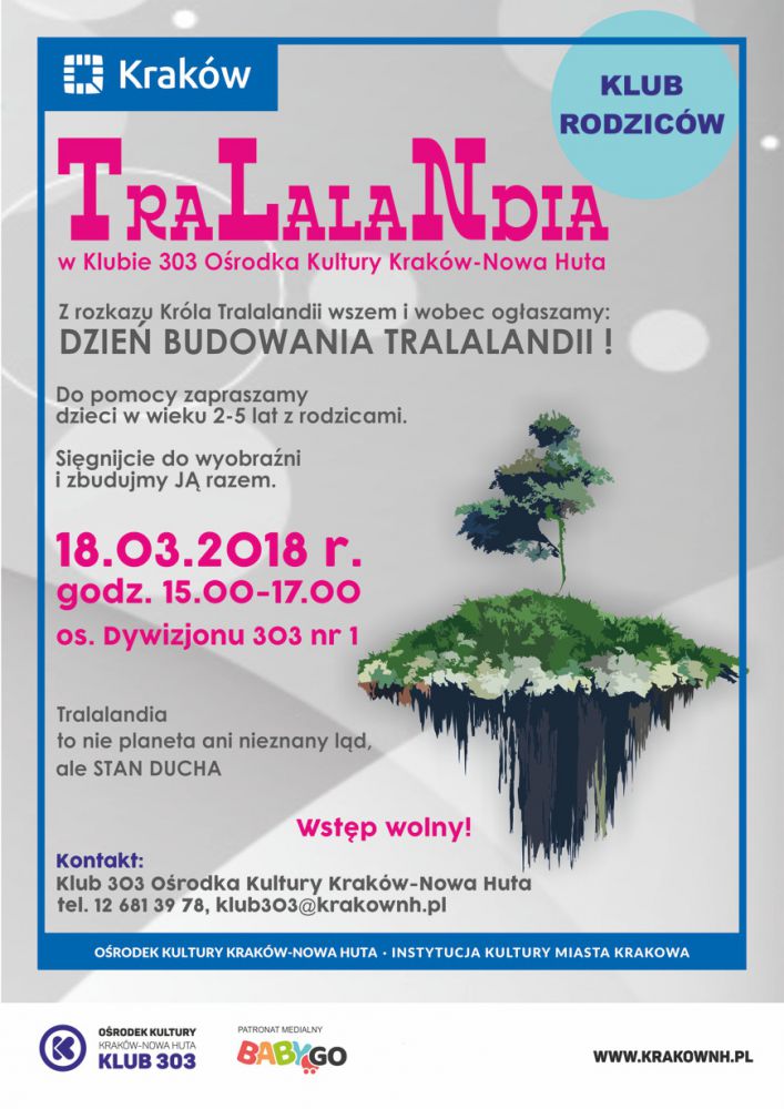 W ubiegłym miesišcu w Klubie 303 Oœrodka Kultury Kraków-Nowa Huta (os. Dywizjonu 303 nr 1) odbył się casting na mieszkańców Tralalandii. Wszyscy kandydaci zdali testy lalalandycznie. Król Tralalandii wysłał z tej okazji do Klubu 303 telegram pochwalny oraz kolejne zadanie, z którym muszš zmierzyć się kandydaci. Tym razem zadanie dotyczy wyobraŸni. Wszyscy kandydaci będš razem budować Tralalandię, tak jak sobie jš wyobrażajš, bo przecież nikt jej nigdy nie widział. Do dyspozycji dzieci i rodziców będš materiały ziemskie typu: gazety, kartony, pudełka, folie, kolorowe papiery, kredki i pisaki. Stworzony obraz Tralalandii zostanie sfotografowany i przekazany Królowi. Impreza dla rodziców z dziećmi w wieku 2-5 lat odbędzie się w niedziele 18.03. w godz. 15.00-17.00.