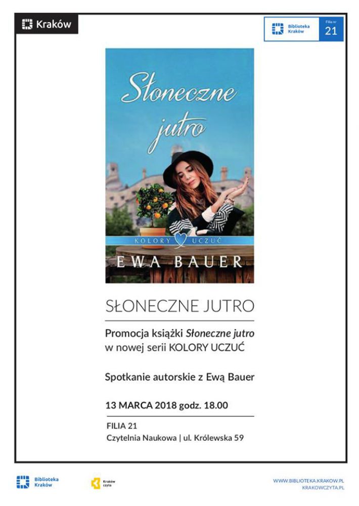 Zapraszamy na wieczór autorski Ewy Bauer i promocję jej najnowszej ksišżki Słoneczne jutro z serii Kolory uczuć.