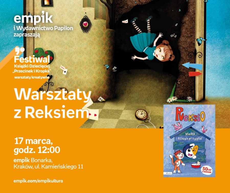 Warsztaty odbędš się w ramach Festiwalu Ksišżki Dziecięcej Przecinek i Kropka. Z tej okazji w salonach Empik na terenie całej Polski odbędš się spotkania z ulubionymi pisarzami i ilustratorami, warsztaty kreatywne oraz zabawy edukacyjne. Festiwal zawita także do Krakowa, gdzie 17, 24 i 25 marca w salonie Empik Bonarka będš miały miejsce się cztery wydarzenia z cyklu: warsztaty z Reksiem, warsztaty plastyczne wokół ksišżki Opowieci na dobranoc dla młodych buntowniczek oraz spotkania z Annš Dziewit-Meller i Renatš Kijowskš.