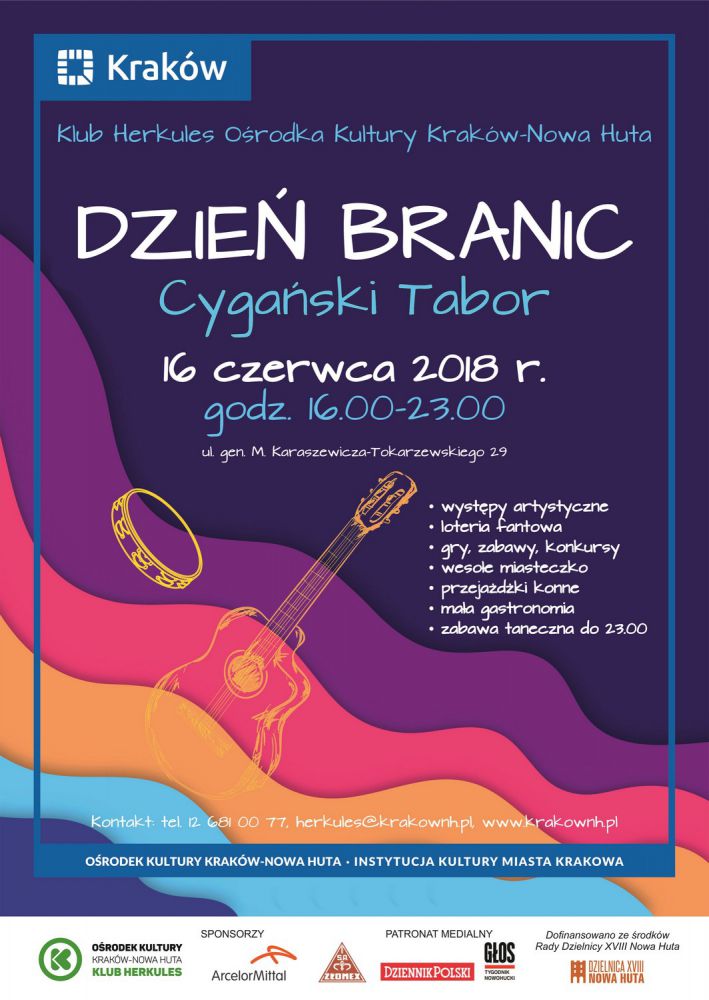 Klub Herkules Orodka Kultury Kraków-Nowa Huta (ul. Gen. M. Karaszewicza-Tokarzewskiego 29) zaprasza 16 czerwca o godz. 16.00 na na rodzinnš imprezę plenerowš Dzień Branic Cygański Tabor. W programie imprezy znajdš się: występy artystyczne dzieci ze Szkoły Podstawowej nr 74, występ dziecięcej grupy baletowej z Klubu Herkules, piosenki cygańskie zaprezentuje zespół Nutki. Wydarzeniu towarzyszyć będš tematyczne konkursy i zabawy: przejażdżki konne, dorożkš, pokaz zręcznociowy w wykonaniu Krakowskiego Szwadronu Ułanów, a także loteria fantowa, wesołe miasteczko. O godz.19.00 rozpocznie się zabawa taneczna z zespołem Pro-Fill do godz. 24.00.