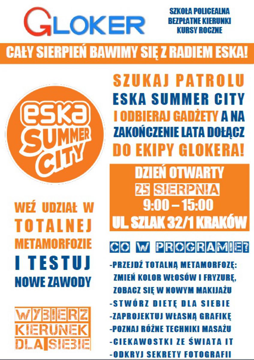 Przez cały sierpień bawimy się z ESKA INFO Kraków, a na zakończenie lata zapraszamy na Dzień Otwarty do Gloker Szkoły Kursy!