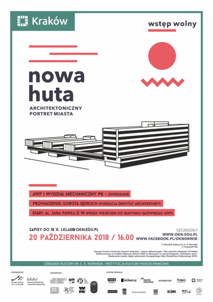 Zwiedzanie kampusu Akademii Wychowania Fizycznego i Wydziału Mechanicznego Politechniki Krakowskiej im. T. Koœciuszki w Czyżynach w ramach projektu Nowa Huta – architektoniczny portret miasta. Prowadzenie: Dorota Jędruch (Fundacja Instytut Architektury). Zapisy do 18 X: j.klas@okn.edu.pl. Wstęp wolny.