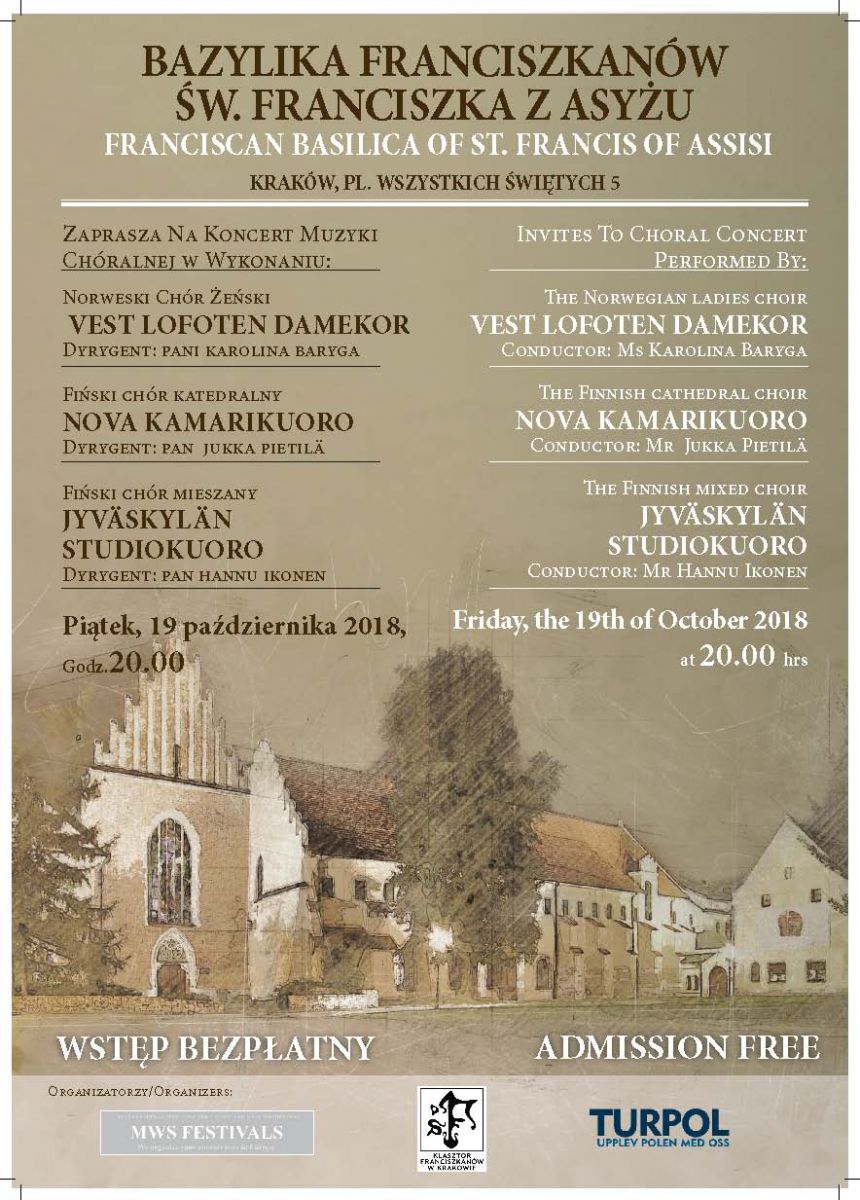 W pištek, 19 padziernika 2018 zapraszamy na godz.20.00 do legendarnych wnętrz Bazyliki Franciszkanów w Krakowie na koncert w wykonaniu chórów: