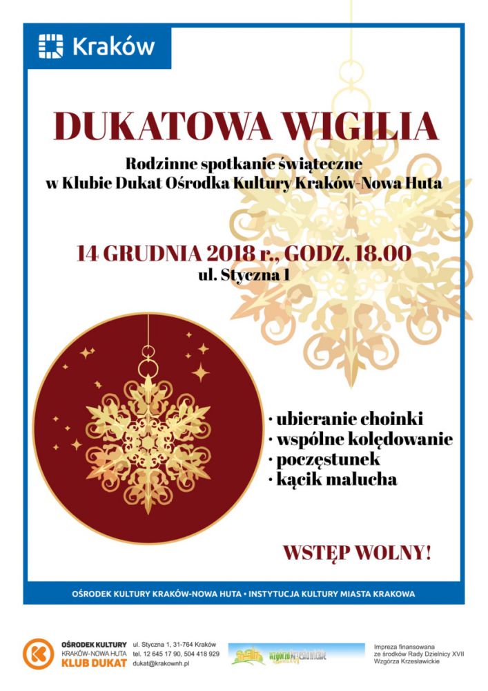 Klub Dukat Oœrodka Kultury Kraków-Nowa Huta (ul. Styczna 1) i Rada Dzielnicy XVII Wzgórza Krzesławickie zapraszajš 14 grudnia o godz. 18.00 przyjaciół, sympatyków i uczestników klubowych zajęć na spotkanie œwišteczne. Wspólnie ubierzemy choinkę, poœpiewamy kolędy i zjemy wigilijny barszcz – w serdecznej atmosferze spędzimy ten grudniowy wieczór.