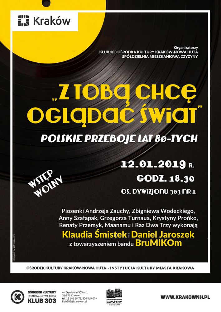 To włanie muzyka lat 80-tych XX wieku i jej twórcy będš głównymi bohaterami wyjštkowego, karnawałowego koncertu, którego organizatorami sš Klub 303 Orodka Kultury Kraków-Nowa Huta i Spółdzielnia Mieszkaniowa Czyżyny. Koncert Z Tobš chcę oglšdać wiat - polskie przeboje dekady lat 80-tych, rozpocznie się 12 stycznia 2019 roku o godz. 18.30 w sali Klubu 303, os. Dywizjonu 303 nr 1. Podczas koncertu wykonane zostanš między innymi Andrzeja Zauchy, Zbigniewa Wodeckiego, Anny Szałapak, Grzegorza Turnaua, Krystyny Prońko, Maanamu, ale też Renaty Przemyk i Raz Dwa Trzy. Różni artyci to różne style muzyczne, które zagoszczš podczas koncertu na klubowej scenie. Zgromadzeni usłyszš utwory, które były szlagierami w czasach swojej wietnoci, ale do których nadal chętnie wracamy i nucimy.