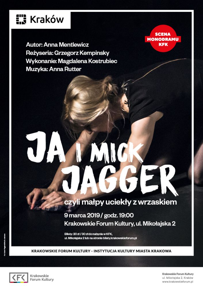 Krakowskie Forum Kultury ma zaszczyt zaprosić na Scenę Monodramu KFK: Ja i Mick Jagger, czyli małpy uciekły z wrzaskiem.