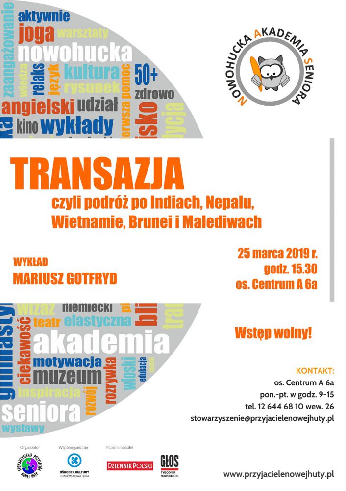 Nowohucka Akademia Seniora (os. Centrum A 6a) zaprasza 25 marca o godz. 15.00 na wykład Mariusza Gotfryda. Tematem wykładu będzie podróż przez kraje azjatyckie, którš goć Akademii odbył po Indiach, Nepalu, Wietnamie, Brunei i Malediwach. Historia i zabytki, zwyczaje, ubiór oraz życie codzienne mieszkańców Azji zostanš pokazane na fotografiach i barwnie omówione przez dowiadczonego podróżnika. Dodatkowš atrakcję stanowić będzie możliwoć bliskiego przyjrzenia się przywiezionym z wojaży pamištkom i przedmiotom codziennego użytku.