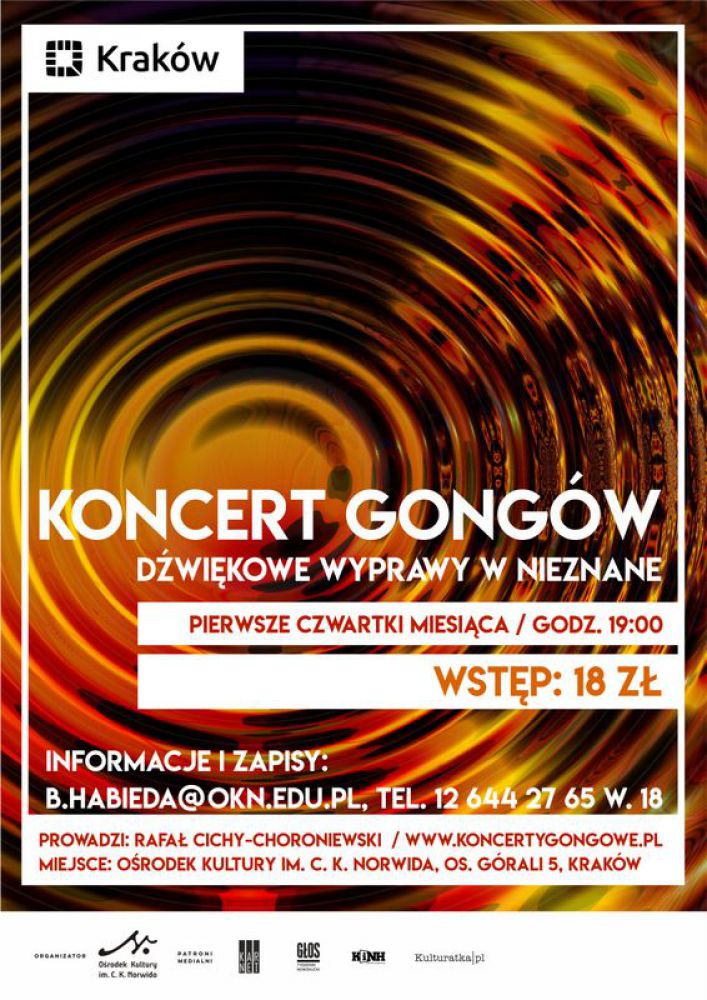 Relaks dla ciała i radoœć dla duszy to w jednym zdaniu cel udziału w koncercie gongowym. Wrażenia dostarczane słuchaczom przez dŸwięki gongu sš jedyne w swoim rodzaju, niepowtarzalne i nieporównywalne z niczym innym. Prowadzi Rafał Cichy-Choroniewski / www.koncertygongowe.pl.