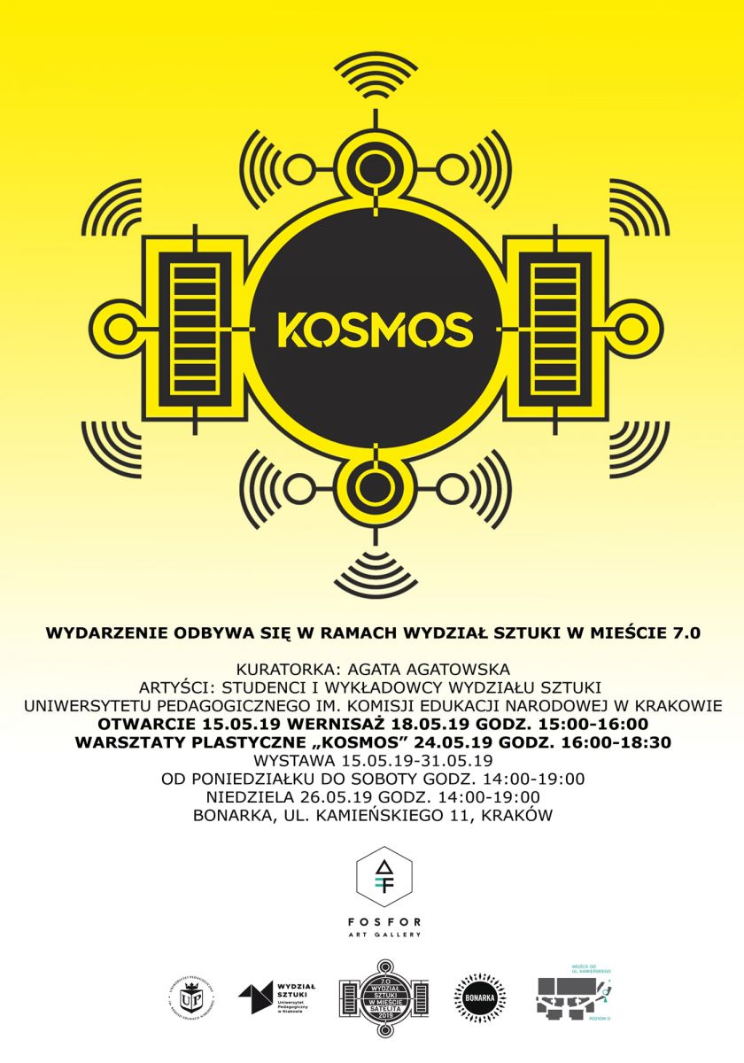 Wydział Sztuki Uniwersytetu Pedagogicznego w Krakowie, organizator akcji Wydział Sztuki w Miecie, oraz Bonarka zapraszajš na wystawę Kosmos od poniedziałku do soboty oraz w niedziele 26 maja, w godz. 14:00 19:00. Wernisaż w Galerii Fosfor odbędzie się 18 maja o godz. 15:00. W czasie trwania wystawy zostanš zorganizowane warsztaty plastyczne, na które centrum zaprasza 24 maja o godz. 16:00.