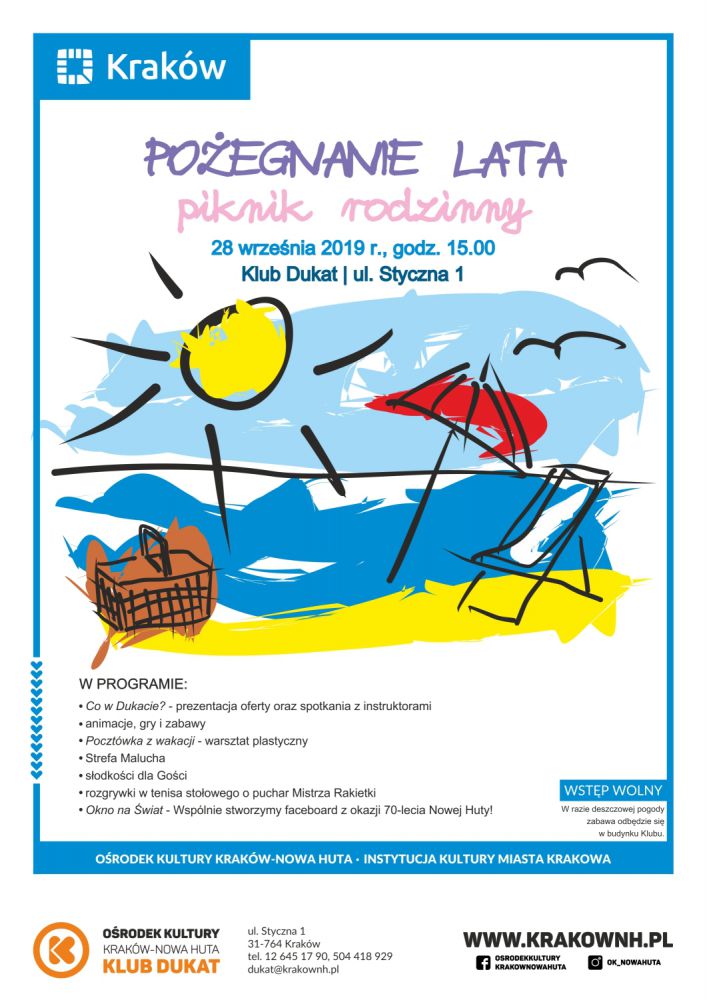 Klub Dukat Oœrodka Kultury Kraków-Nowa Huta (ul. Styczna 1) zaprasza w sobotę 28 wrzeœnia od godz. 15.00 na Pożegnanie Lata – rodzinny piknik. Na uczestników czeka wiele atrakcji! Od gier i animacji poprzez warsztaty plastyczne aż po rozgrywki w tenisa stołowego. Z okazji 70-lecia Nowej Huty wspólnie stworzymy również faceboard przedstawiajšcy jej wizerunek.