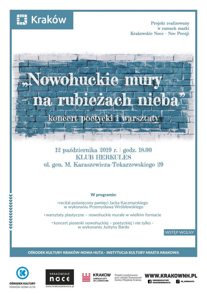 Tradycyjny koncert poetycki odbywajšcy się od lat w najbardziej peryferyjnych klubach Orodka Kultury Kraków-Nowa Huta tym razem w Klubie Herkules Orodka Kultury Kraków-Nowa Huta (ul. gen. M. Karaszewicza-Tokarzewskiego 29) na osiedlu Branice. W tym roku składać się będzie z trzech częci. Pierwsza powięcona będzie Jackowi Kaczmarskiemu, za jej gwiazdš będzie Przemysław Wróblewski krakowski poeta, bard i zdobywca wielu nagród w konkursach poezji piewanej. Druga częć to wielkoformatowe działania plastyczne, które sprawiš, że uczestnicy koncertu przeniosš się do wiata barwnych poetyckich murali nawišzujšcych do różnych budowli charakterystycznych dla nowohuckich dzielnic. Ostatniš częciš koncertu będzie recital Justyny Bardo, wokalistki zespołu No Stress, znanej z programu The Voice of Poland, która w trakcie występu płynnie przejdzie od utworów poezji piewanej do klimatu nowohuckiej potańcówki z dawnych lat.