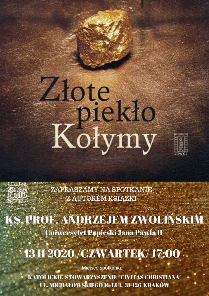 Serdecznie zapraszamy 13 II w czwartek o godz. 17.00 do krakowskiego oddziału "Civitas Christiana" na spotkanie z ks. prof. Andrzejem Zwolińskim, autorem ksišżki "Złote piekło Kołymy" wydanej przez Instytut Wydawniczy PAX.