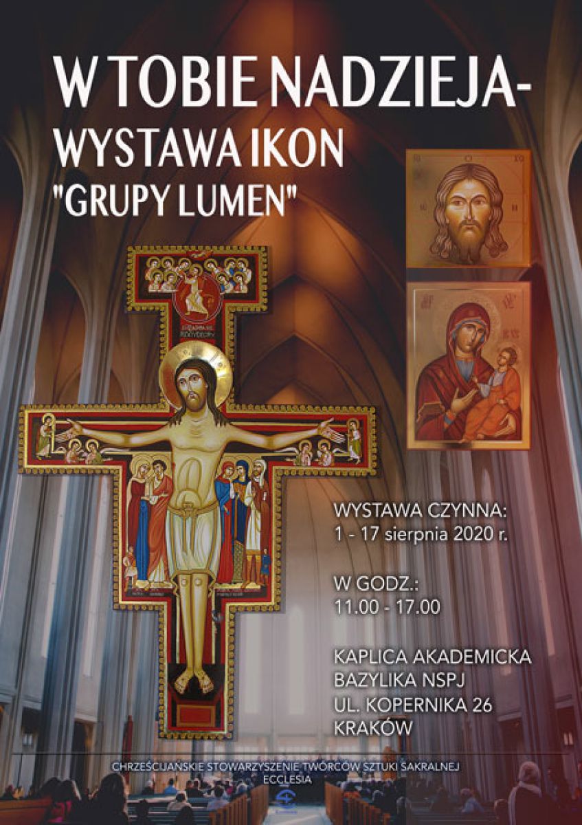 Zapraszamy do odwiedzenia wystawy ikon prezentowanych przez czonkw Grupy Lumen p.t.: W TOBIE NADZIEJA Wystawa prezentowana jest w pomieszczeniach Kaplicy Akademickiej przy Bazylice NSPJ, ul. Kopernika 26, Krakowie w dniach 1-17 sierpnia 2020 r., w godz. 11.00- 17.00.