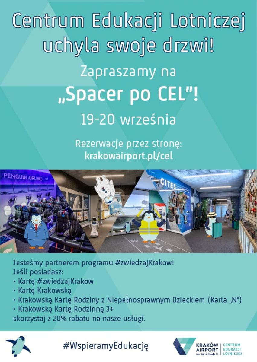 W weekend, 19-20 wrzenia, Centrum Edukacji Lotniczej w Balicach zaprasza na Spacer po CEL, czyli ekscytujšcš wycieczkę po jedynym w Polsce orodku popularyzujšcym wiedzę z zakresu lotnictwa cywilnego. Będzie można zwiedzić sale zaaranżowane na terminal pasażerski i wnętrze samolotu, wcielić się w rolę pasażera lub stewardessy, a nawet, dzięki rzeczywistoci wirtualnej, zaparkować samolot na płycie lotniska.