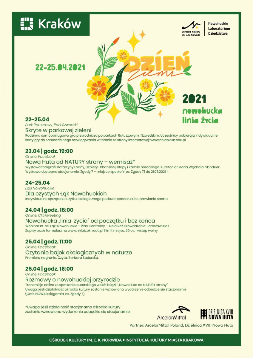 Pracownia Animacji Ekologicznej Orodka Kultury im. C .K. Norwida już przez blisko trzy dekady włšcza się w celebrowanie tego ogólnowiatowego więta. Podczas tegorocznych obchodów zapraszamy na Nowohuckš linię życia, czyli w przestrzeń od Łšk Nowohuckich po Aleje Róż. Jest to przestrzeń, która mocno zaznacza się w krajobrazie Nowej Huty, zarówno tym architektonicznym, krajobrazowym, ale też społecznym. Wzdłuż tej ważnej osi rozgrywać się będš poszczególne wydarzenia obchodów Dnia Ziemi 2021.