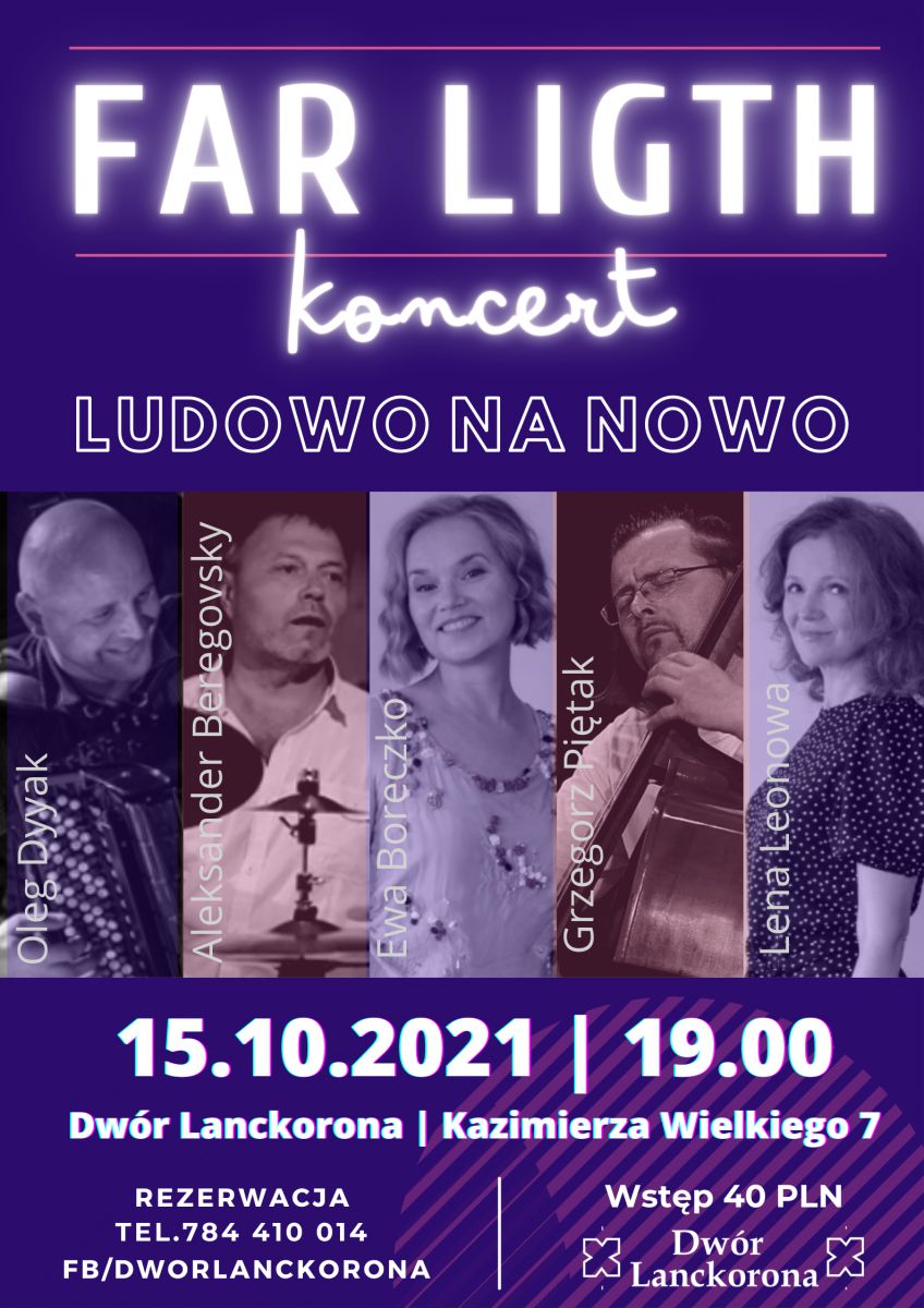 W skład zespołu "Far Light" wchodzč artyci reprezentujčcy bogate dowiadczenie i różnorodne tradycje muzyczne. Zespół wykonuje niebanalne kompozycje na pograniczu jazzu, muzyki klasycznej oraz współczesnej, ze sporč przestrzenič do improwizacji, która daje możliwoæ zamanifestowania indywidualnoci każdego z muzyków zespołu. Projekt "Ludowo na nowo" stanowi próbê swoistego odwieżenia utworów wokalnych o charakterze ludowym przy wykorzystaniu rodków muzyki współczesnej. Proste melodie ludowe zostały zaaranżowanie na głos klasyczny z dodaniem bardziej złożonego akompaniamentu z nowoczesnymi rodkami harmonicznymi i brzmieniowymi, ale z zachowaniem ducha muzyki ludowej - jej szczególnej ekspresji i motorycznoci.