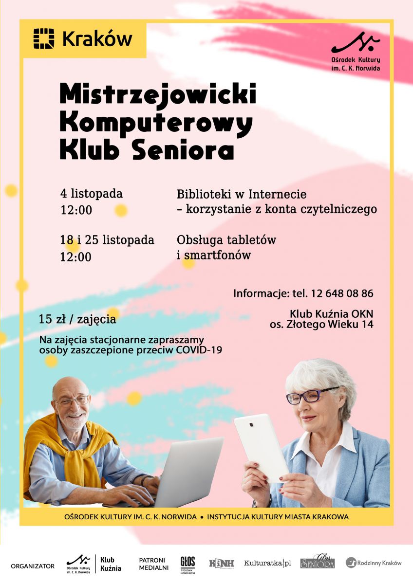 Mistrzejowicki Komputerowy Klub Seniora zaprasza na otwarte spotkania w Klubie Kunia OKN, os. Złotego Wieku 14 w Krakowie.