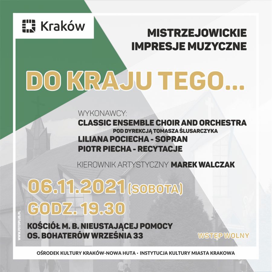 Z okazji przypadajšcej w tym roku dwusetnej rocznicy urodzin Czwartego Wieszcza, Sejm RP ogłosił rok 2021 rokiem Cypriana Kamila Norwida. Organizatorzy Mistrzejowickich Impresji Muzycznych: Rada Dzielnicy XV Mistrzejowice, Orodek Kultury Kraków-Nowa Huta oraz Parafia Matki Bożej Nieustajšcej Pomocy pragnš wpisać się w te obchody i zaprosić do medytowania poezji tego wybitnego polskiego twórcy w ramach koncertu Do kraju tego