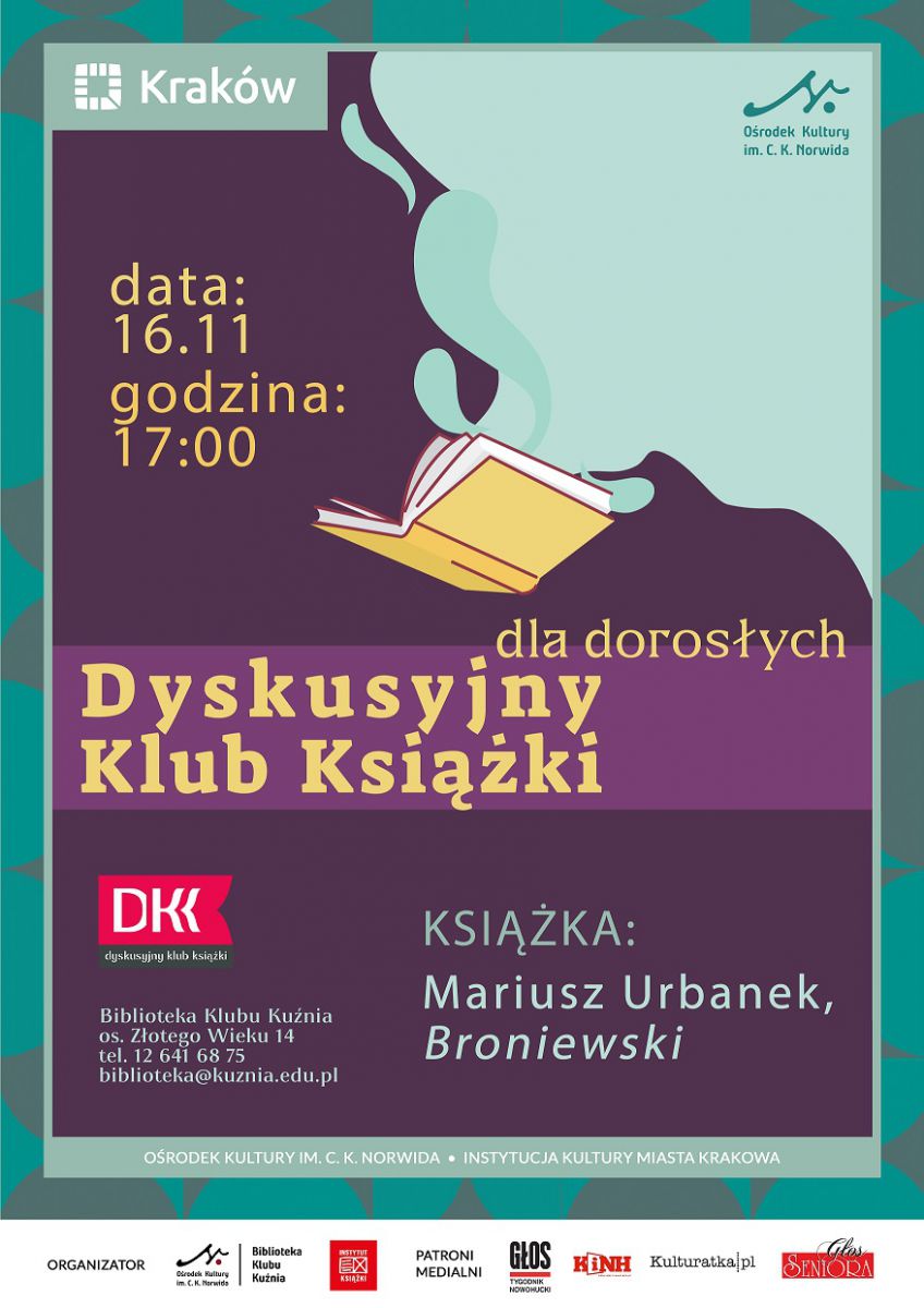 Zapraszamy na spotkanie Dyskusyjnego Klubu Ksišżki dla dorosłych na rozmowę o ksišżce Mariusza Urbanka, zatytułowanej Broniewski. Miłoć, wódka, polityka". Spotkanie poprowadzi Barbara Cygan. Dyskusyjne Kluby Ksišżki tworzš czytelnicy, których łšczy pasja czytania i poznawania nowych ksišżek. Klubowicze spotykajš się w raz w miesišcu, żeby dyskutować o wczeniej wybranej i przeczytanej ksišżce.