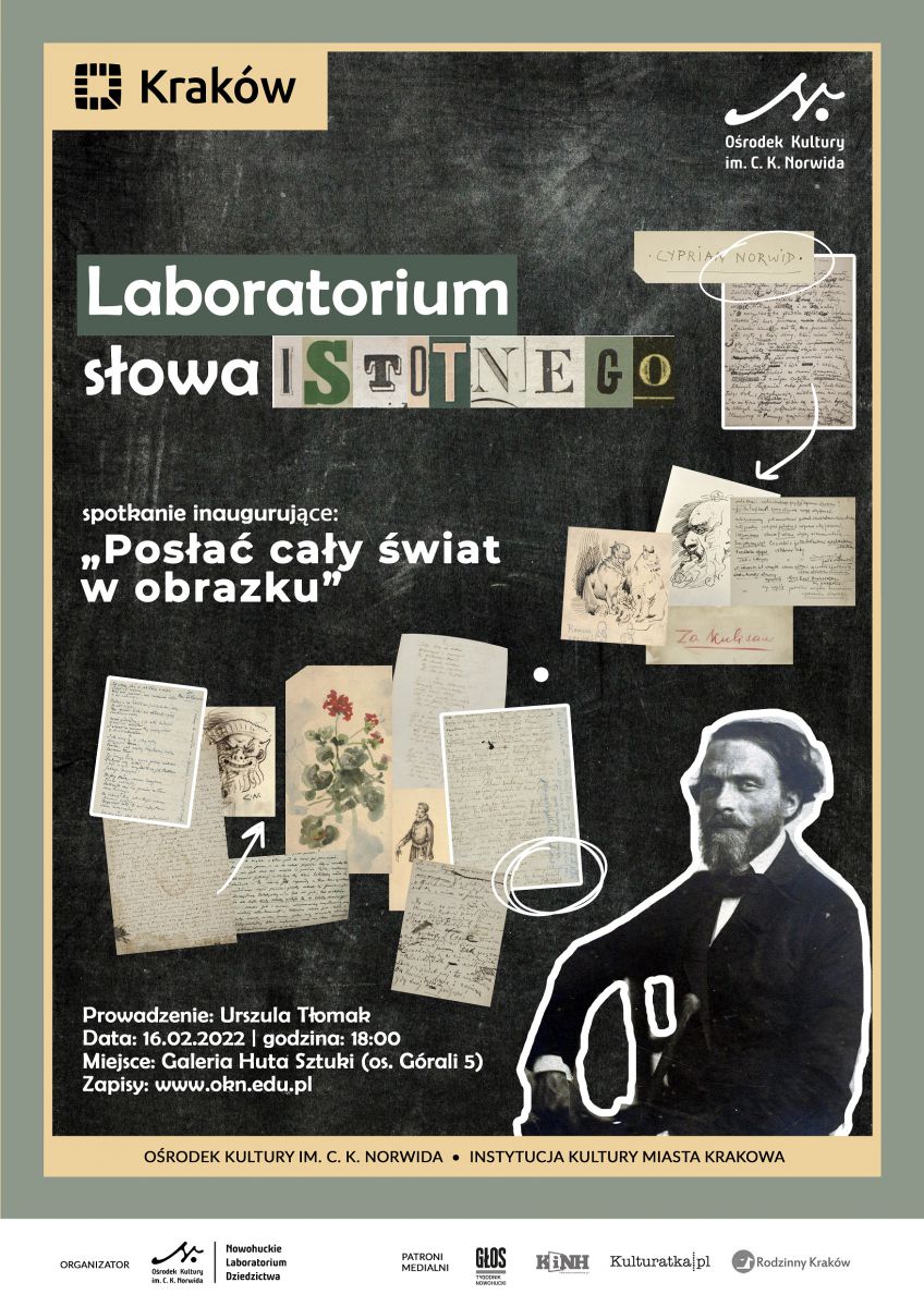 Laboratorium słowa istotnego to cykl spotkań skupionych wokół interpretacji słowa poetyckiego i twórczoci literackiej. Na inaugurujšce spotkanie zapraszamy poezję Norwida, szczególnie przyjrzymy się cyklowi poetyckiemu Vade-mecum. Jednym z ważniejszych wštków tego zbioru jest temat człowieka jako istoty ukształtowanej przez historię, cywilizację i naturę. Bohater tych utworów poetyckich, uwikłany jest w relacje z otoczeniem zbiorowociš, cywilizacjš, a tragizm jego poczynań polega na niemożnoci nawišzania kontaktu, braku porozumienia z innymi ludmi.