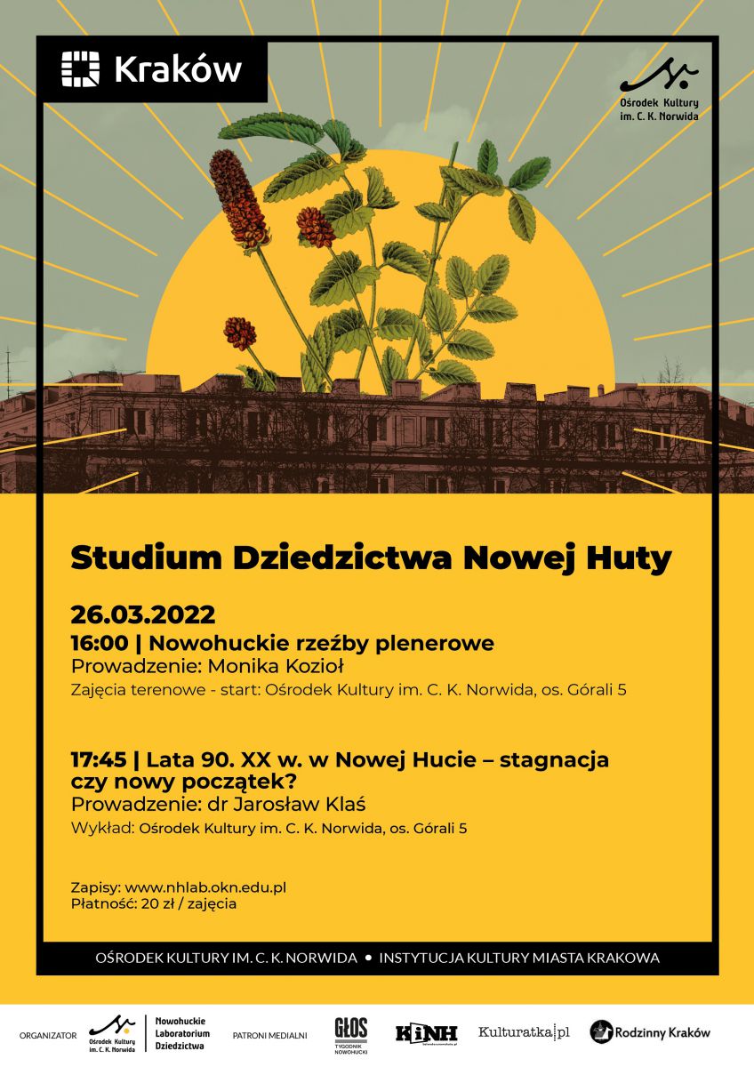 Podczas zajęć terenowych omówione zostanš wybrane rzeby plenerowe znajdujšce się w Nowej Hucie, niezwišzane z upamiętnieniem konkretnych osób czy wydarzeń. Będzie można poznać historię ich powstania, autorów i cechy stylowe. Opowieć osadzona zostanie w szerszym kontekcie historii rodowiska artystycznego w Nowej Hucie. Studium Dziedzictwa Nowej Huty - dwusemestralny program edukacyjny dla młodzieży i dorosłych pogłębiajšcego wiedzę o dziedzictwie kulturowym i przyrodniczym Nowej Huty od prehistorii do współczesnoci.