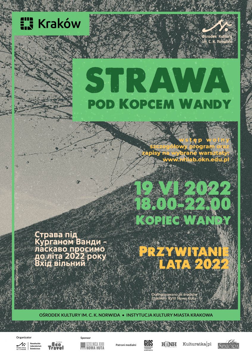 Chcielibymy zaprosić i poinformować o współorganizowanym przez nas wydarzeniu "Strawa pod Kopcem Wandy - przywitanie lata 2022", które odbędzie się 19 czerwca, w godzinach 18:00-22:00. Zwracajšc się ku zapomnianym słowiańskich zwyczajom chcemy choć na jeden wieczór ożywić najbardziej tajemniczy zabytek archeologiczny jakim jest, ukryty w Nowej Hucie, Kopiec Wandy.