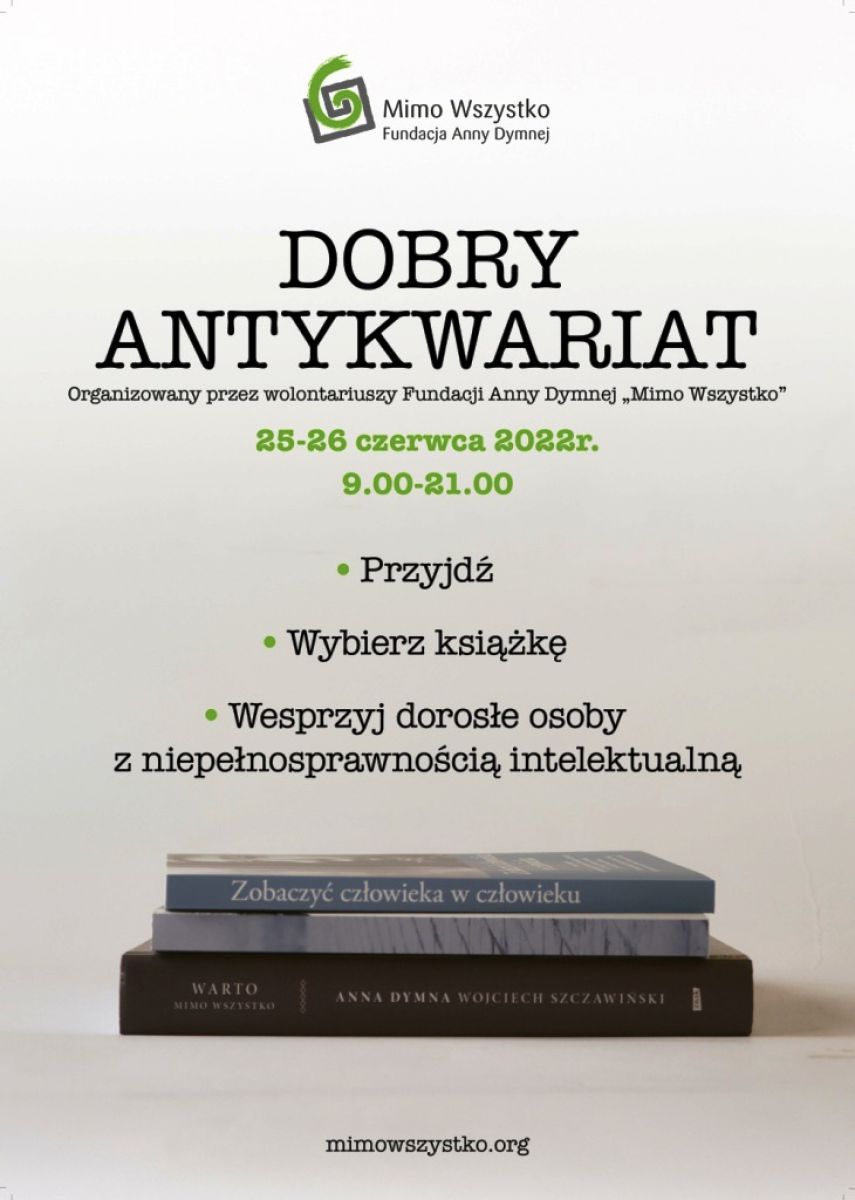 Dobry Antykwariat w Galerii Bronowice to dwa dni wypełnione ksišżkami, ciekawymi zajęciami i pomaganiem. Jak wzišć w nich udział? Każdy, kto zechce wesprzeć Fundację Anny Dymnej Mimo Wszystko dowolnš darowiznš, będzie mógł wybrać dla siebie jednš z wielu znajdujšcych się na stoisku ksišżek. Organizatorzy przygotowali szerokš ofertę literackš, dzięki czemu na półkach w Galerii Bronowice pojawiš się interesujšce pozycje, m.in.: beletrystyka, poezja, albumy fotograficzne o różnej tematyce, literatura dla dzieci, a nawet ksišżki kucharskie oraz obcojęzyczne. Organizację będzie można wesprzeć na dwa sposoby: wrzucajšc gotówkę do oznakowanej puszki w ramach zbiórki publicznej nr 2021/1775/OR oraz bezgotówkowo, za porednictwem datkomatów Donateo. Zebrane rodki wesprš podopiecznych z orodka terapeutyczno-rehabilitacyjnego Dolina Słońca, zostanš także przeznaczone na budowę i wyposażenie orodka wytchnieniowego w Lubiatowie.
