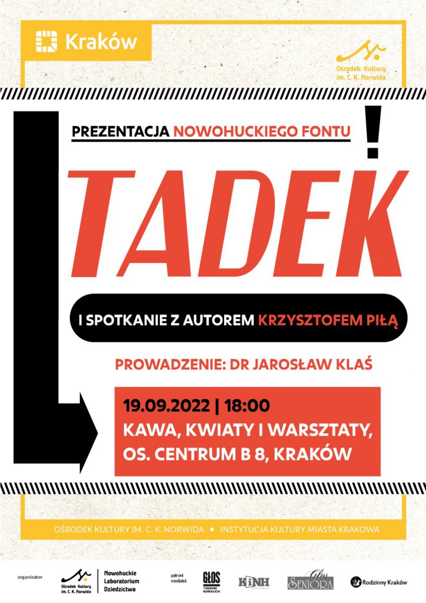 Font „Tadek” to autorski krój pisma w formie cyfrowej, inspirowany historycznym liternictwem stosowanym na tabliczkach adresowanych i numerycznych Nowej Huty. Zawiera majuskuły (zgodnie z wzorcem historycznym) w wersji regular oraz italic. Font powstał na zlecenie Ośrodka Kultury im. C. K. Norwida, a jego autorem jest Krzysztof Piła.