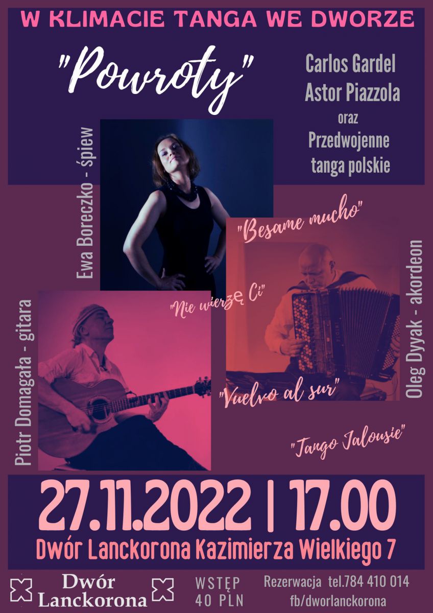 Koncert w rytmie tanga - w programie koncertu znajdą się tanga Carlosa Gardela i Astora Piazzolli oraz kilka przedwojennych tang polskich. Będzie to próba powrotu do miejsc i zdarzeń z przeszłości, ale też - a może przede wszystkim - w głąb samego siebie sprzed lat.