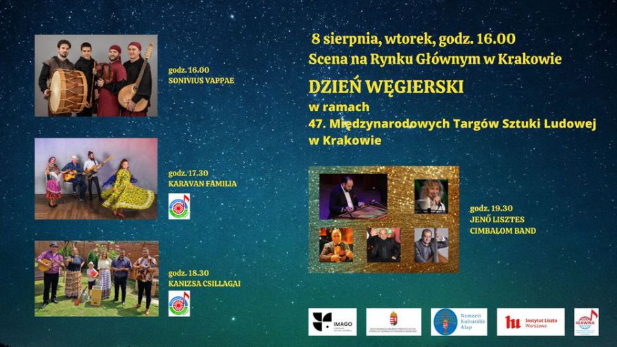 Centrum Sztuki Ludowej IMAGO, Konsulat Generalny Węgier oraz Instytut Ferenca Liszta we współpracy z organizatorami Międzynarodowego Dnia Pieśni Cygańskiej zapraszają na rynek Główny w Krakowie na koncerty pod Wieżą Ratuszową prezentujące muzykę węgierską oraz muzykę węgierskich Romów.