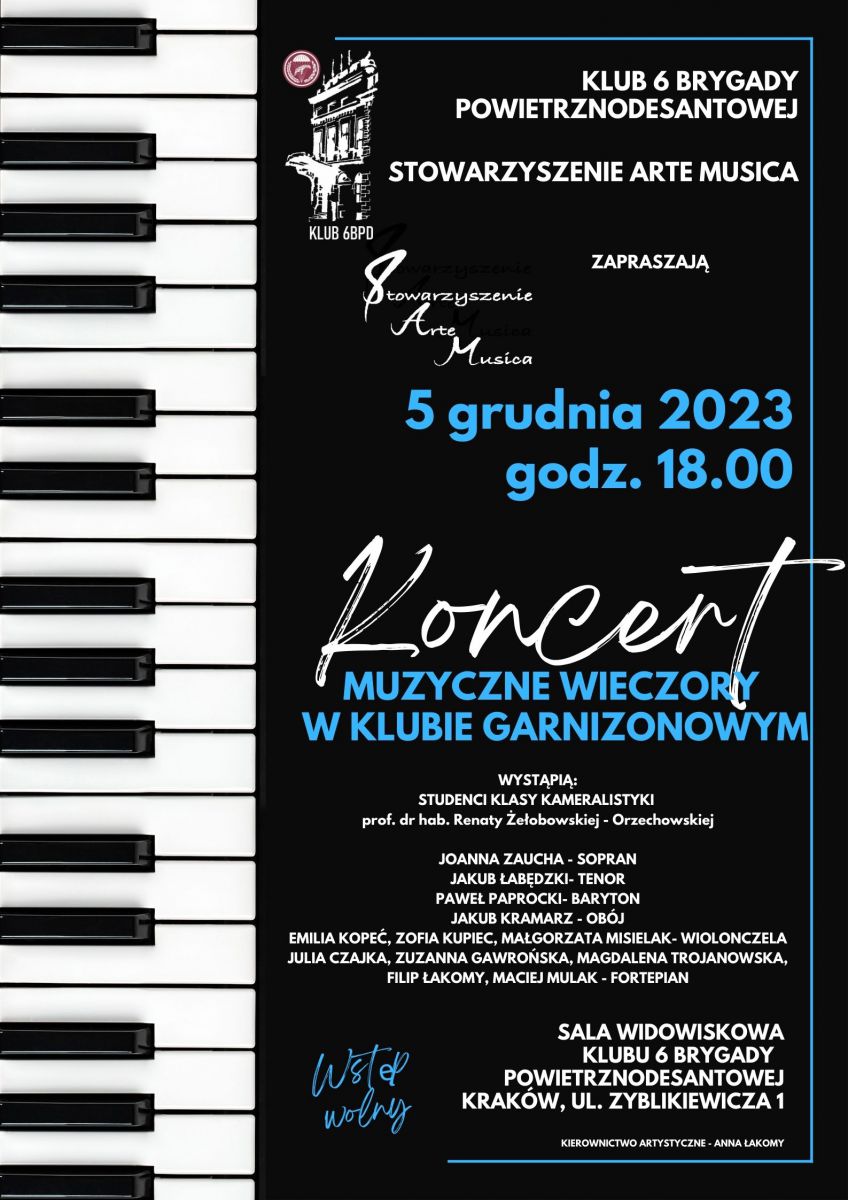 5 grudnia o godz. 18.00 zapraszamy na kolejny koncert z cyklu "Muzyczne Wieczory w Klubie Garnizonowym".