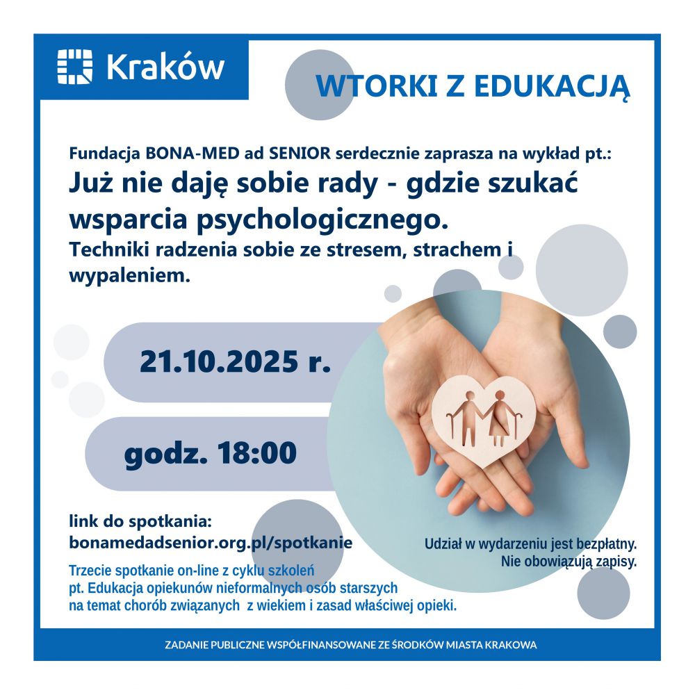 Serdecznie zapraszamy wszystkie osoby opiekujące się osobami starszymi na wykład on-line pt.: „Już nie daję sobie rady - gdzie szukać wsparcia psychologicznego. Techniki radzenia sobie ze stresem, strachem i wypaleniem”.