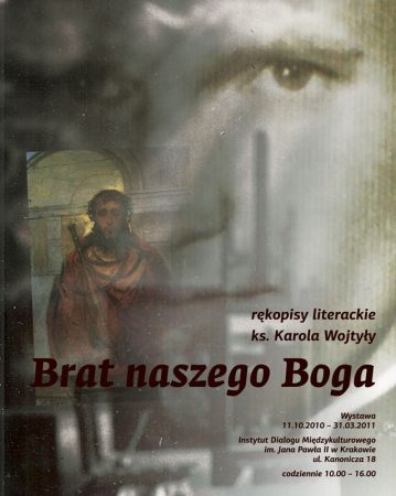 Na wystawie prezentowane będš niepokazywane dotšd: brulion dramatu Karola Wojtyły Brat naszego Boga, ze zbiorów Archiwum Kurii Metropolitalnej w Krakowie i rękopis ze zbiorów Archiwum Krakowskiej Kapituły Katedralnej, fotografie z czasów, gdy był kapłanem i biskupem diecezji krakowskiej (ze zbiorów Archiwum Kurii Metropolitalnej w Krakowie i Archiwum Artystycznego i Biblioteki Teatru im. Juliusza Słowackiego w Krakowie). Wystawa jest twórczš odpowiedziš na pytanie o transformacje Karola Wojtyły i jego stosunku do sztuki. W 1944 roku Karol Wojtyła przedstawił pierwszš wersję Brata naszego Boga ks. Józefowi Matlakowi, proboszczowi parafii w. Stanisława Kostki na Dębnikach w Krakowie, proszš o wstępnš ocenę. Młody Karol pracował wtedy jeszcze w kamieniołomie w Solvayu i angażował się w prace Teatru Rapsodycznego. Jednoczenie uczestniczył już w studiach teologicznych podziemnego seminarium duchownego przygotowujšc się do kapłaństwa. Dramat powięcony w. Bratu Albertowi Chmielowskiemu pojawił się cztery lata od napisania Jeremiasza (1940 r.). Nad tekstem tego utworu pracował Karol Wojtyła do 1950 roku, kiedy powstała jego ostateczna wersja opublikowana po raz pierwszy w Poezjach i dramatach w 1979 roku. Pierwsza wersja z 1944 roku nosi wyranie charakter teatru rapsodycznego: osoby nie majš własnych imion, dialogi sš bardzo surowe, brak akcji. We wstępie do ostatecznej wersji, napisanej po powrocie z Rzymu między 1948-1950, ks. Karola Wojtyła zadeklarował, iż jego dramat jest próbš przeniknięcia człowieka i dotarcia do tego, co jest niedostępne na zewnštrz. Jest bowiem przekonany, że u ródeł człowieczeństwa tkwi pierwiastek pozahistoryczny, który pragnie ukazać w swoim dramacie, w mniejszym stopniu dbajšc o szczegóły. (ks. Jan Machniak, Bóg i człowiek w poezjach i dramatach Karola Wojtyły Jana Pawła II. Kraków, 2007).