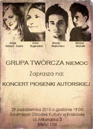 Grupa Twórcza "Niemoc" w składzie: Alicja Hawryœ-Suska - œpiew, Anna Ryglowska - œpiew, Michał Wojtusik - fortepian, œpiew, Maciej Wnêkowicz - gitara, œpiew.