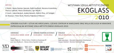 10 lutego (czwartek), o godz. 18.00, w Willi Decjusza odbędzie się wernisaż poplenerowej wystawy Ekoglass Festiwal 2010. Na wystawie zaprezentowane zostanš prace dwunastu artystów z Czech, Polski i Słowacji, które powstały w czasie plenerów w historycznych orodkach hutnictwa szkła w Szklarskiej Porębie (PL) oraz Desnej (CZ). W wernisażu wezmš udział artyci czescy: Jakub Berdych, Jíří uhájek, Andrej Nèmeth, Oldřich Plíva i polscy: Mariusz Łabiński i Igor Wójcik. Ekspozycji towarzyszy film dokumentalny prezentujšcy proces powstawania eksponowanych dzieł w czasie obu plenerów.