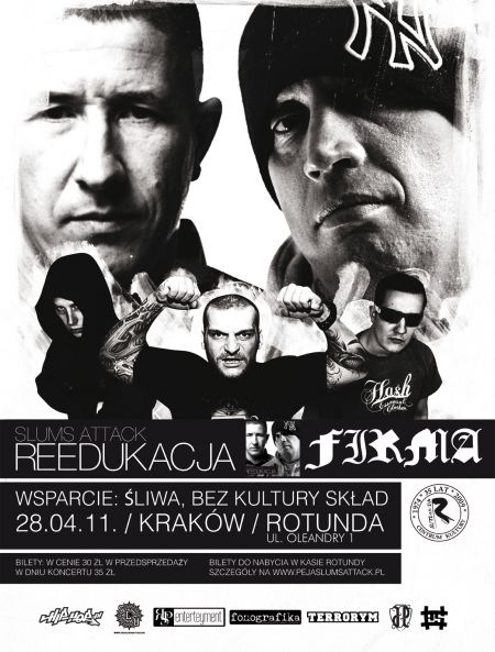 28.04 w krakowskim klubie Rotunda zagra legendarna formacja z Poznania w składzie DJ. Decks i Peja czyli Slums Attack. Promujšcy najnowszš płytę "Reedukacja", kóra pięć dni po premierze uzyskała status platynowej (debiut na pierwszym miejscu zestawienia OLiS).