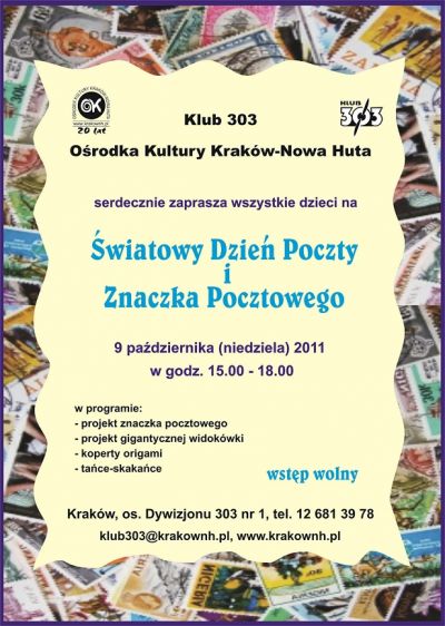 Klub 303 Oœrodka Kultury Kraków – Nowa Huta (os. Dywizjonu 303) zaprasza dzieci z rodzicami na obchody Œwiatowego Dnia Poczty i Znaczka Pocztowego.