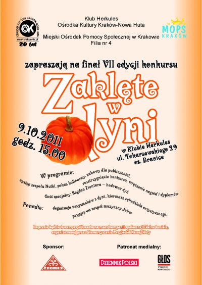 Klub Herkules Orodka Kultury Kraków Nowa Huta (ul. Tokarzewskiego 29) i Miejski Orodek Pomocy Społecznej w Krakowie Filia nr 4 zapraszajš na VII edycję konkursu, którego twórczym tworzywem jest dynia.