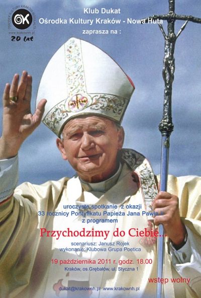 Klub Dukat Oœrodka Kultury Kraków-Nowa Huta (ul. Styczna 1) zaprasza 19 paŸdziernika (œroda) 2011 r. o godz. 18.00 na spotkanie Przychodzimy do Ciebie poœwięcone osobie Jana Pawła II.