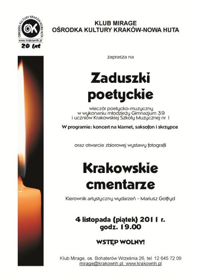 Klub Mirage Oœrodka Kultury Kraków-Nowa Huta (os. Bohaterów Wrzeœnia 26) zaprasza 4 listopada (pištek) 2011 r. o godz. 19.00 na wieczór poetycko – muzyczny, podczas którego uczniowie Gimnazjum nr 39 będš recytować wiersze. Imprezę uœwietni koncert na skrzypce, saksofon i klarnet w wykonaniu uczennicy Krakowskiej Szkoły Muzycznej nr 1 Magdaleny Ocias.