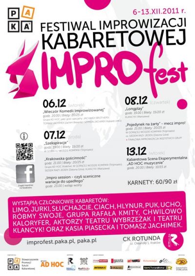 Stowarzyszenie Promocji Sztuki Kabaretowej PAKA oraz Grupa AD HOC zapraszajš na ImproFest - I Festiwal Improwizacji Kabaretowej.