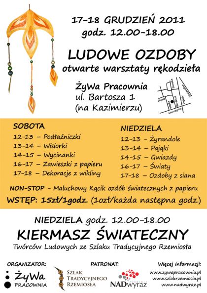 ŻyWa Pracownia i Fundacja NADwyraz zapraszajš w najbliższy weekend (17-18.12) na Kazimierz na Warsztaty Ludowych Ozdób i Kiermasz wišteczny na Szlaku Tradycyjnego Rzemiosła.